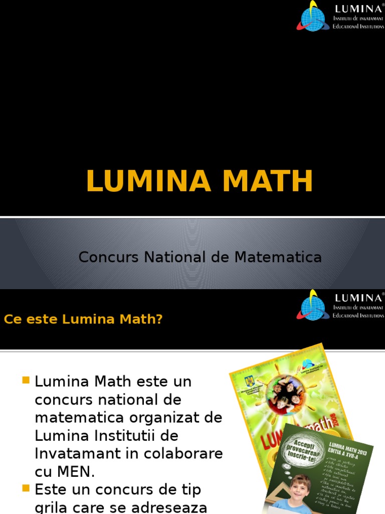 Maxilmul este de 100 de puncte. Concursul de matematica luminamath se adreseaza elevilor claselor a ii a a iii a si pana la clasa a viii a. Lumina institutii de invatamant va face toate eforturile pentru a acoperi impreuna cu inspectoratele judetene scolare o arie cat mai mare de examinare.