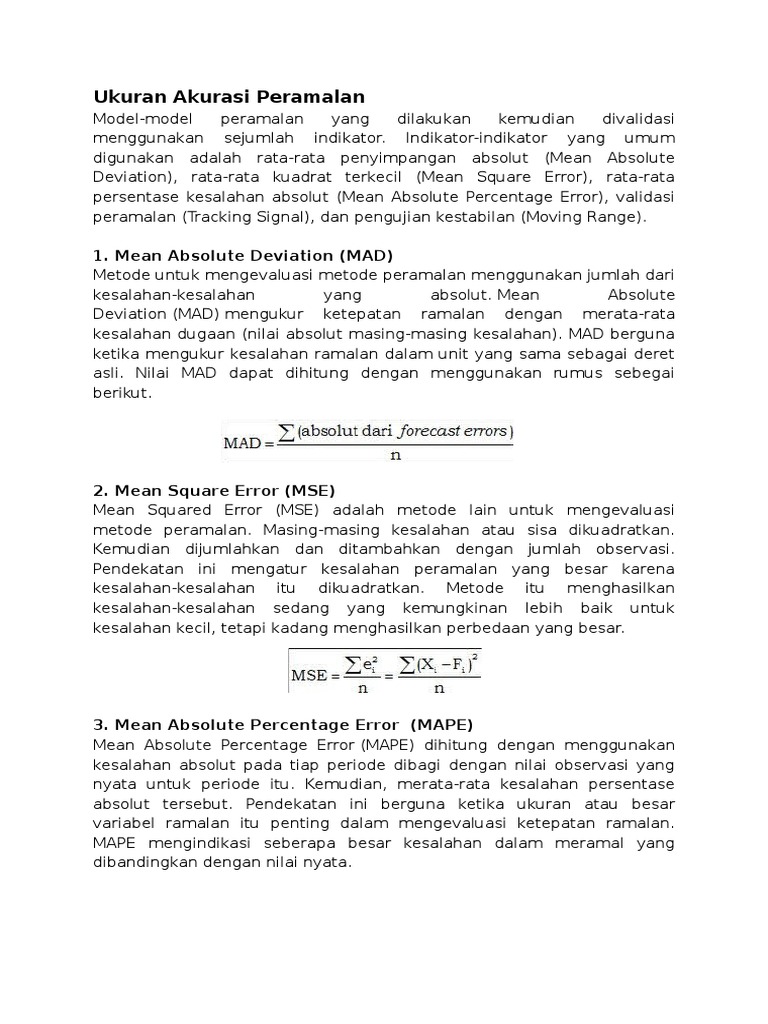 Kesalahan kuadrat rata rata mean absolute deviation mse. Deviasi mutlak rata rata mean absolute deviation mad mad adalah nilai yang dihitung dengan mengambil jumlah nilai absolut dari setiap kesalahan peramalan dibagi dengan jumlah periode data n. Mean absolute error mpe mean percentage error dam mape mean absolute percentage error.