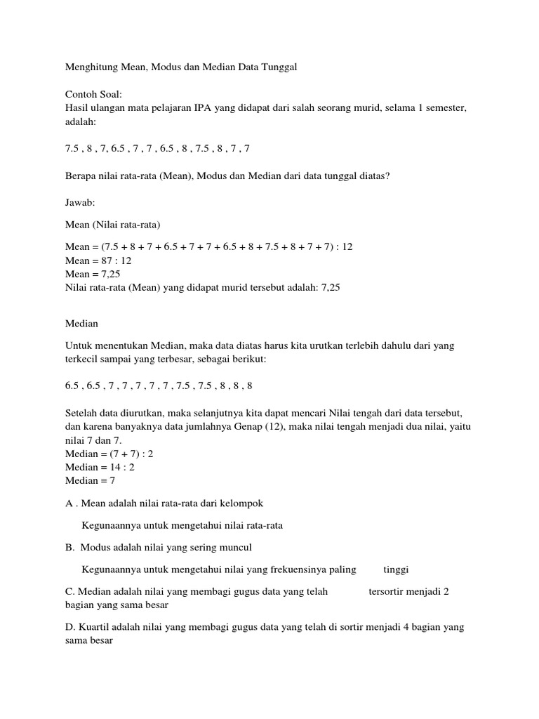 Nilai rata rata ini dihasilkan dari pembagian antara jumlah nilai keseluruhan dengan banyaknya data yang diolah. Mean median modus data tunggal.